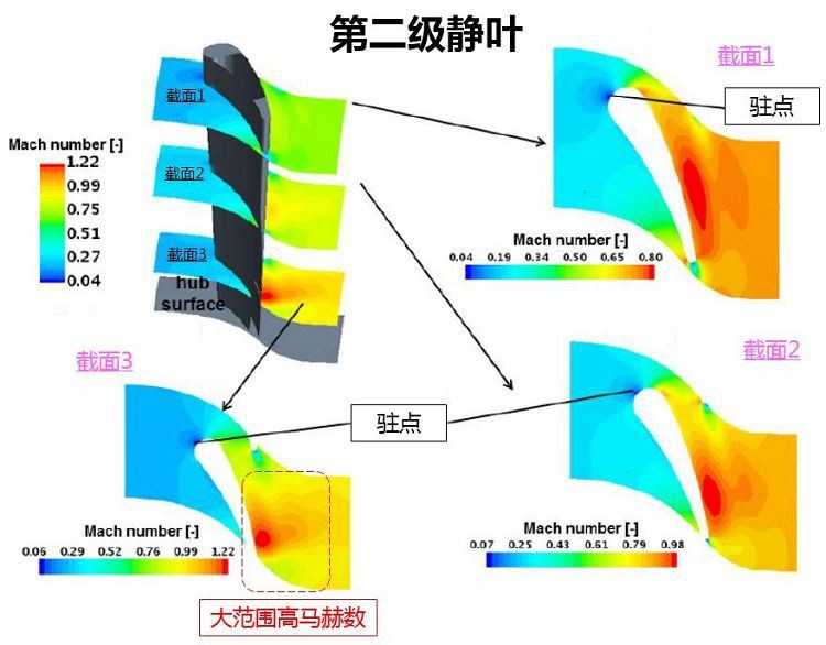 Kolmiulotteisen CFD-virtauskentän analyysin avulla voidaan havaita, että tämäntyyppisen yksikön staattisten terien ja liikkuvien terien aerodynaaminen rakenne on suhteellisen taaksepäin, ja ilmavirran jakautumisessa on monia ongelmia: kohtuuton nopeus ja kulmajakauma, erotettu virtaus ja taaksepäin -profiili. Kuten kuvassa 4 esitetään, toisen vaiheen roottorin terän pysähtymispiste poikkeaa etureunasta ja sijaitsee paineen etupäässä. On selvää vaikutus kulma menetys. Imupinnan nopea alue lisää virtaushäviötä. Ensimmäisen ja toisen vaiheen roottorin terien imupinnoilla on ilmeisiä virtauksen erotusilmiöitä, mikä johtaa pyörrehäviön ja epävakaaseen sisäiseen virtauskenttään. Kaikki nämä ovat johtaneet alhaiseen virtaustehokkuuteen ja virtauskulku on optimoitava.